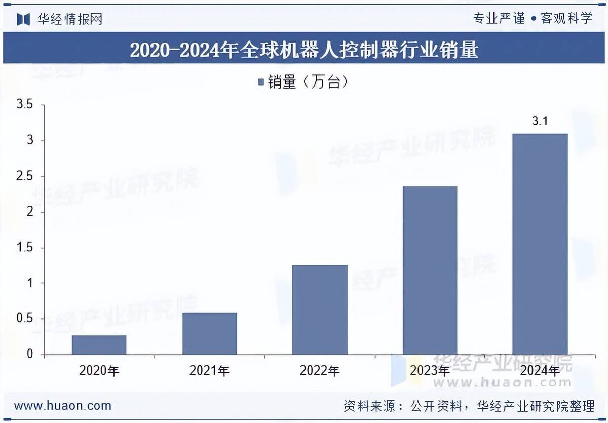 2024年全球机器人控制器行业销量达3.1万台。受益于制造业智能化升级与新兴场景扩容,行业延续稳健增长态势。汽车制造、3C电子仍是核心需求领域,新能源、物流仓储及医疗等新兴领域需求快速攀升,带动多轴联动、智能适配型控制器销量增长。